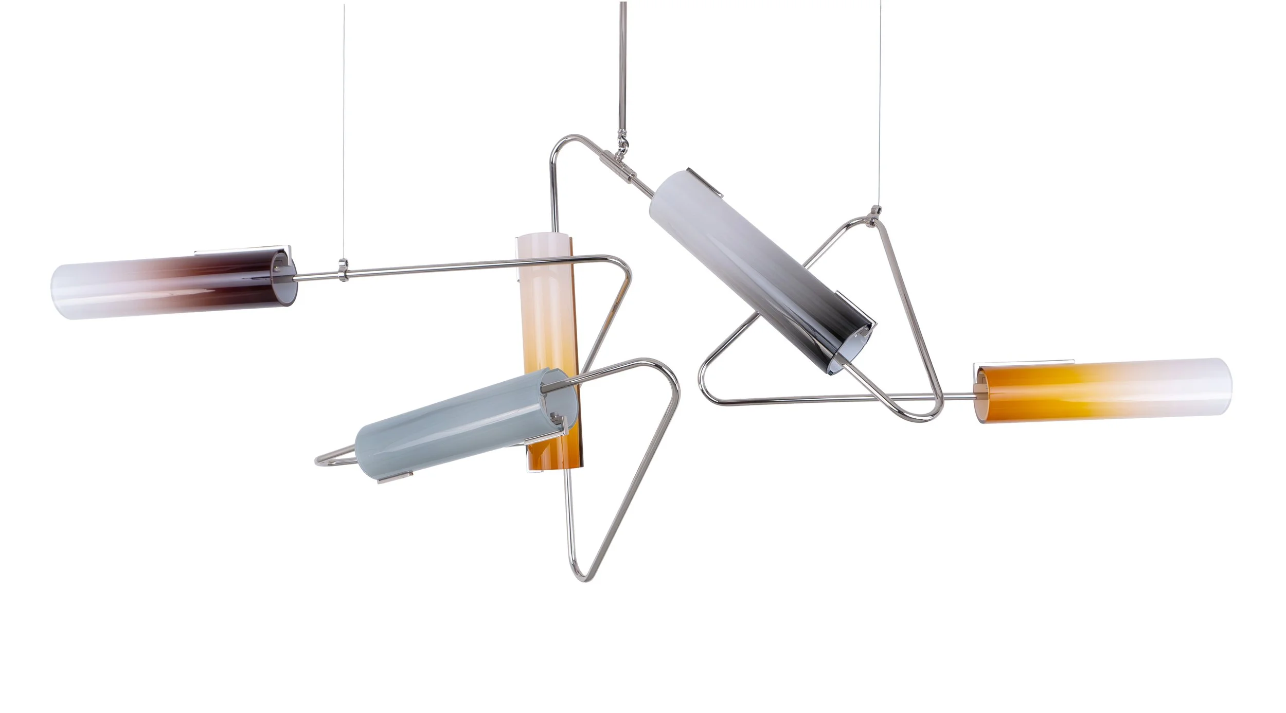 The Continuum Collection was inspired by New York’s vibrant street art. The structure utilizes custom bent tubes that can be connected and arranged in a variety of ways to produce multiple styles and sizes. The hand blown glass shades are proportioned to accentuate the sculptural lines of each model. Shades can be sequenced with contrasting glass colors and patterns or used as single tones for a paired down look.